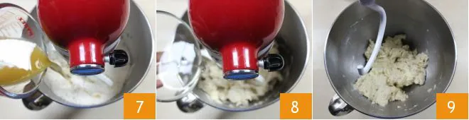 Attach the flat beater to the stand mixer, and once turned on, first add the water containing the malt, yeast, and oil 7 and then start kneading at medium speed, if kneading by hand, gather the ingredients firmly. After 1 minute, also add the water in which you dissolved the salt 8, continuing to knead. When the mixture has gathered around the beater, replace it with the dough hook 9 and continue kneading at medium-low speed for at least 5 minutes, until the dough is smooth and homogeneous.