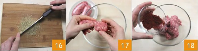 Meanwhile, focus on the filling: first, fill a pot with a diameter of about 10 inches with water and bring it to a boil. The size of the pot is important because it must hold the sausage entirely. Then place the fennel seeds on a cutting board and finely chop them with a knife or even with a coffee grinder 16. Then cut the surface of the sausages, crumble them in a bowl 17, and add the sweet red chili powder 18. You can use sausage instead of salamella, even the one typical of your area or salami paste. Also, flavor it as you prefer: with spices or aromatic herbs or replacing the chili with sweet paprika.