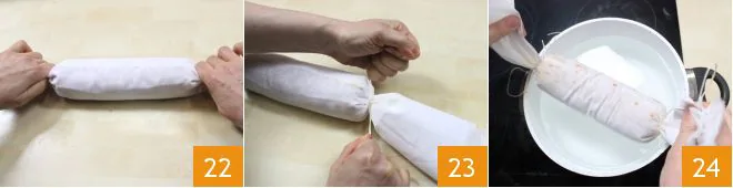 Wrap the sausage tightly 22, securing the ends with cooking twine 23 and transfer it to the pot with boiling water, cook for 10 minutes 34. The water should simmer and not boil turbulently, otherwise it will ruin the salami.