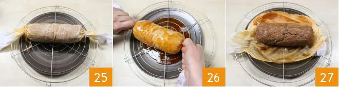 Once cooked, drain the sausage on a rack 25, with a plate placed underneath, and squeeze it by tightening the edges of the muslin 26, so that the excess water and fat are expelled. Then open the muslin or towel in which you wrapped the mixture and let it cool at room temperature 27. It is important that the filling does not cool completely but reaches room temperature, otherwise, the dough might not rise correctly.