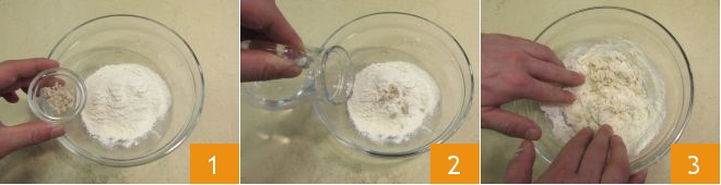 To prepare S bread, start making the starter dough at least 8 hours before (you can start the evening before to bake the next day). Pour the flour into a bowl, crumble in the fresh yeast 1, and gradually add room temperature water 2. After gathering the ingredients with a fork, knead with your fingertips to combine 3.