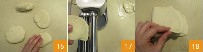 Flatten the dough pieces by pressing them with your hands 16. Take one dough piece, keeping the others under plastic wrap, and pass it through a pasta roller on the widest setting 17, then fold it in half 18, rotate it 90°, and pass it through the roller again, repeating this operation 15-18 times to refine the dough.