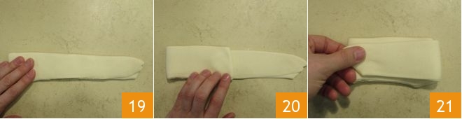 As you roll the dough, try to always obtain a smaller rectangle, you should get one about 1.5 inches wide 19. Then fold the outer flaps, making a three-part fold (20-21), and widen it one last time in the pasta roller.