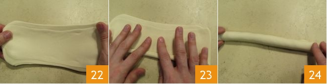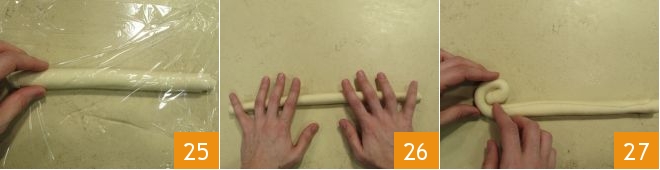 Proceed the same way with the other 3 dough pieces; as you make the cylinders, keep them aside covered with plastic wrap 25. Once all 4 cylinders are obtained, stretch them to about 12 inches long 26, then roll one side halfway 27.