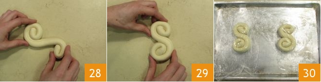 Do the same from the opposite side, reversing the rotation direction 28 to get the typical S shape 29. Transfer the rolls to a baking tray, cover them with plastic wrap, and let them rise for another 2 hours in a warm place.