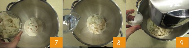 125 g of starter dough 7, and all the water 8. Turn on the stand mixer at low speed for 7 minutes, after which you can add the lard 9,