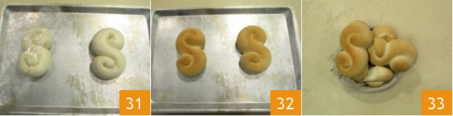 When the rolls have increased in volume, they will be ready for baking 31. Bake them in a preheated static oven at 390°F for 30 minutes. Once the time is up, the rolls will look golden on the surface 32, let them cool slightly and serve them 33.
