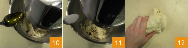 the oil 10, and the salt 11. Continue kneading for another 7-8 minutes, until the dough clings to the hook and appears compact. Then transfer it to the work surface, knead it with your hands 12, and quickly shape it into a ball.
