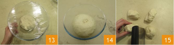Place it to rise for 2 hours in a bowl, covered with plastic wrap 13, in the oven turned off with the light on. After 2 hours, take the risen dough 14, gently transfer it to the work surface and divide it into 4 15.