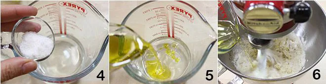 In the remaining water, dissolve the salt 4 and add the oil 5, mix well, then gradually pour the obtained liquid into the flour, continuing to combine 6. Knead everything for 10 minutes, or until you obtain a compact dough.