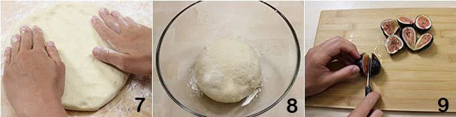 Now transfer the dough onto a floured work surface and continue kneading with your hands for another 5 minutes 7. When you have obtained a sufficiently compact and elastic dough, form a ball and place it in a floured bowl, covered with plastic wrap 8. Put the bowl in the closed and turned-off oven, where you will let it rise for at least 2 hours. After the necessary time, wash the figs well and cut them into quarters, keeping the skin on 9,