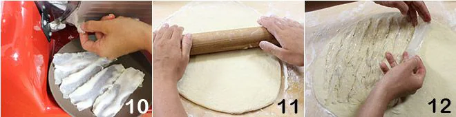 then cut 30 slices from a whole piece of lard, using a slicer (if you don't have one, we recommend buying pre-sliced lard) 10. Sprinkle the work surface again with a little flour and roll out, with the help of a rolling pin, the bread dough into an oval shape about 0.5 to 0.75 inches thick 11. Lay the slices of lard on the dough, completely covering its surface 12,