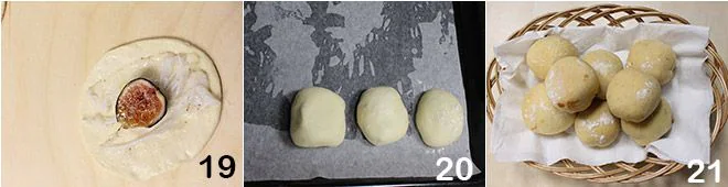 A tasty alternative could be to prepare individual portion rolls. Form disks about 3.5 inches in diameter with the bread dough, then place a few slices of lard and half a fig on each 19. Brush the edges of each disk with water and proceed to close them following the recipe instructions. Place the rolls on a baking tray covered with parchment paper 20 and bake at 392°F for 35-40 minutes 21.