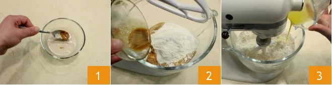 To prepare tricolor bread, dissolve the dry yeast in a little warm water (taken from the 1 cup needed for the dough) and add the malt 1 (you can replace the malt with sugar: in this case, add it to the sifted flour). Mix with a teaspoon and add the mixture to the sifted flour placed in the bowl of a stand mixer 2; work the ingredients with the flat beater at medium speed, then add the egg 3