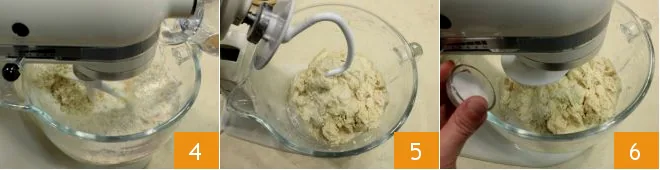 and the amount of warm water indicated for the dough 4. Continue kneading and when the mixture is smooth, stop the mixer and replace the beater with the dough hook 5, add the salt 6