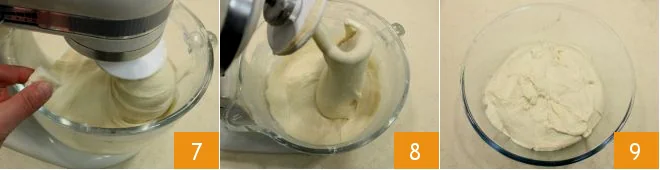 add 1 tablespoon of water and blend everything 13 until you get a creamy mixture; then drain the cream of excess water 14. Then take back the dough that has doubled in volume 15