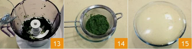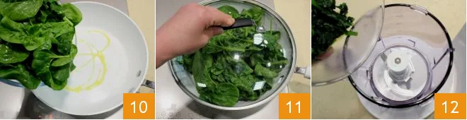 Meanwhile, wash the spinach and stew them in a pan with a drizzle of oil covered with a lid (10-11). Once cooked, let them cool and then pour them into the blender 12