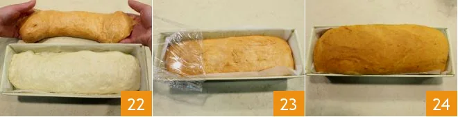 Proceed in the same way and lay the red dough in the pan 22. Cover with plastic wrap 23 and let rise for at least 30 minutes away from drafts. After the necessary time, bake the tricolor bread in a preheated static oven at 392°F for about 60 minutes (356°F for 50 minutes if using a convection oven). Check the cooking with a skewer before finishing baking; when the tricolor bread is cooked, take it out of the oven and let it cool for at least 20 minutes in the pan 34 and then invert it onto a rack to cool completely!