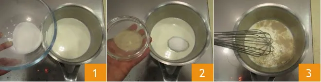 To make the panettone cake with Nutella®, start with the decoration of Dried Orange Slices (you can find the preparation details on our website; this decoration is optional). Then move on to the cream: pour 50 ml (about 1/4 cup) of fresh liquid cream into a saucepan, add the sugar 1 and powdered agar agar 2. Stir with a whisk 3 and bring to just below boiling.