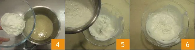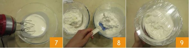 Meanwhile, pour the remaining 200 ml (about 3/4 cup) of very cold fresh liquid cream into a bowl and whip it with electric beaters 7 until it is foamy. At this point add the freshly whipped cream to the now cold cream 8. Stir gently with a spatula, cover with plastic wrap 9 and place in the fridge to set for about 2 hours.