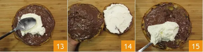 then pour over 1/3 of the yogurt cream and spread it evenly 13. At this point, fill the second slice with the remaining amount of Nutella® and place it on top of the other (the side with Nutella® should be up) 13. Finish by covering the entire surface with the remaining yogurt cream 15, spreading for a snowy landscape effect.