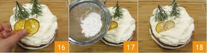 Now proceed with the decoration: insert two rosemary sprigs laterally, positioning them with the tips of the needles pointing downwards, to simulate small pine trees. Now apply the two dried orange slices 16 and finish with a dusting of powdered sugar 17. Your spectacular panettone cake with Nutella® is ready to be brought to the table 18.