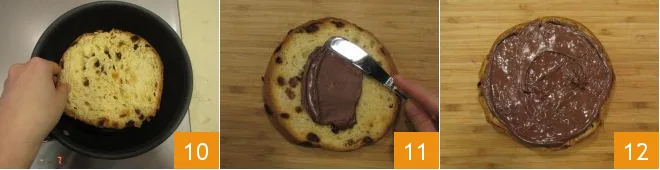 Toast two slices of panettone in a very hot pan 10 until golden. After the setting time, retrieve the cream from the fridge to assemble the dessert. Fill a slice of panettone with half the amount of Nutella® 11, spread it over the entire surface 12,