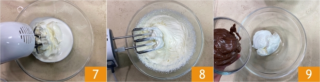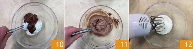 Whip with electric beaters 7 until you get a smooth and frothy cream 8. Now, focus on the second cream: in a bowl, combine the mascarpone and hazelnut spread 9.