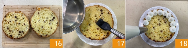 Incorporate the whipped cream into the hazelnut cream 13 by gently folding from bottom to top until you achieve a homogeneous cream 14. Transfer the creams into two pastry bags with a plain 12-14 mm tip. You are ready to assemble the dessert: take the panettone and, starting from the base, cut out two slices about 1.5 inches thick 15.
