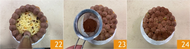 Decorate the cake with dollops of mascarpone and hazelnut cream 22, then dust with bitter cocoa 23 and garnish with pieces of gold leaf 34. Let your panettone cake rest in the refrigerator for a couple of hours before serving!