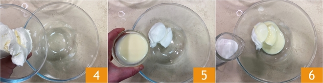 Move on to the mascarpone cream: pour the mascarpone 4, condensed milk 5, and fresh cream 6 into a large bowl.
