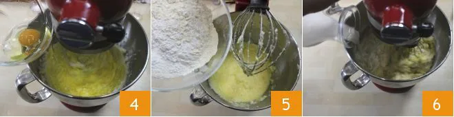 Add the eggs one at a time 4, the dry ingredients 5, and finally the milk in a thin stream 6, continuing to mix.