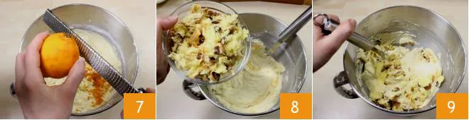 When the ingredients are well combined, add the grated zest of an untreated orange 7 and the previously shredded panettone 8, then incorporate it into the mixture with a spatula 9.