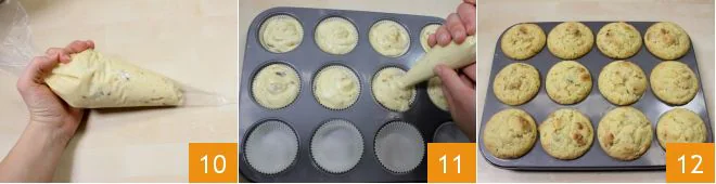 Transfer the mixture into a piping bag 10, prepare a muffin pan with liners, and fill them to the edge 11. Bake them in a preheated oven at 350°F for 25 minutes 12: here are your panettone muffins ready!