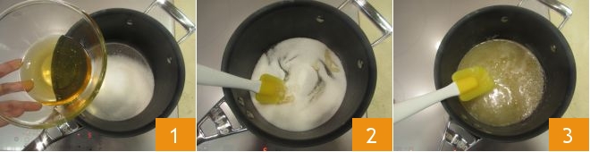 To prepare the panforte, first pour the sugar and honey into a saucepan 1; then stir 2 until it melts 3.