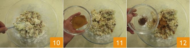 continuing to stir with a spoon 10. Do not worry if the dough is too tough, this is normal. At this point, add a pinch of cinnamon 11, finely ground cloves 12, and coriander