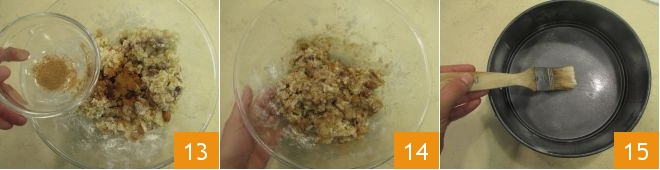 and powdered nutmeg 13. Mix everything again, by hand if it's more convenient for you, to blend the ingredients well 14; you will need to work it quite vigorously. Now butter a 8-inch springform pan 15