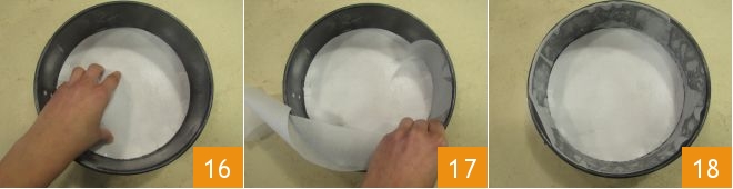 and place the wafer sheet on the bottom 16. Then cut a strip of parchment paper, to the thickness of the mold and the same length as the circumference: use it to line the entire circumference of the mold (17-18).