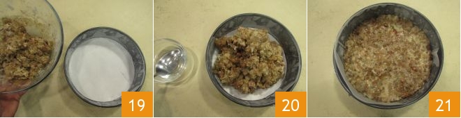 Pour the mixture into the mold 19, then dip a spoon in a bowl of water and use the back to level the surface of the cake, continuing to wet as needed: wetting the spoon will help you press the surface of the cake to distribute the dough evenly across the pan (20-21).