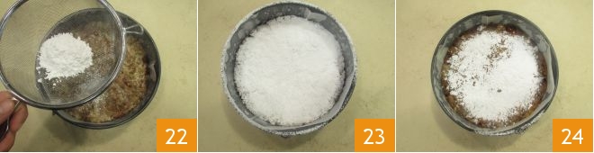 Dust the panforte with about 2 teaspoons of powdered sugar (22-23), it should be perfectly covered. Bake in a preheated static oven at 430°F for about 10 minutes. After this time, take the panforte out of the oven 34 and let it cool for just a few minutes; it should not be cold, otherwise, it will be difficult to remove from the mold.