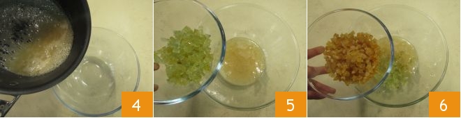 At this point, transfer to a Pyrex bowl 4. Add both the candied citron 5 and the candied orange 6