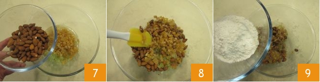 and the almonds 7. Mix everything 8, then also incorporate the flour 9