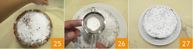 After that, remove the panforte from the mold 25, remove the parchment paper and dust again with powdered sugar 26, before serving it 27.