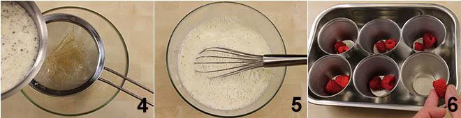 When the cream has reached the correct temperature, remove the saucepan from the heat, strain the hot cream through a fine-mesh sieve to remove the vanilla bits, and pour it into the bowl containing the squeezed gelatin 4. Mix well to dissolve the gelatin 5 and if necessary, return the mixture to the heat for a few minutes. Prepare 6 molds with a diameter of 3.15 inches and a capacity of about 1/2 cup and lay 2 washed and dried raspberries at the bottom 6 and