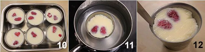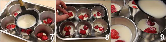 pour the first layer of panna cotta into the mold to cover the raspberries halfway up their height 7. Let the first layer set in the refrigerator for about 1 hour or in the freezer for 30 minutes; meanwhile, cover the remaining mixture with a layer of plastic wrap, making a small hole in the surface so air can pass through, and keep it at room temperature, away from heat sources, stirring with the whisk from time to time. After the indicated time, place two more raspberries inside the mold 8 and cover with the second layer of panna cotta 9.