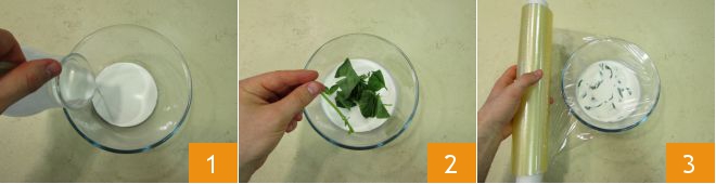 To prepare the savory panna cotta with cherry tomato coulis, start with the panna cotta base. In a bowl, pour the cream 1, then break the basil leaves by hand and add the sprig as well 2. Mix well and cover with plastic wrap 3, leaving to infuse in the fridge for at least half an hour. After this time, the cream will have a pleasant basil aroma and flavor.