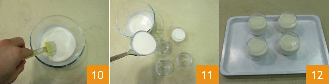 Quickly stir to dissolve everything 10, then adjust with salt and white pepper. Transfer the mixture into 4 cups 11, place them on a tray 12, and transfer them to the fridge to set for about an hour.