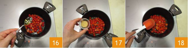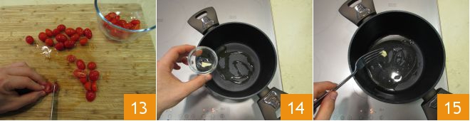 Meanwhile, prepare the tomato coulis. Wash the cherry tomatoes and cut them in half with a knife 13. In a saucepan, heat a drizzle of oil with half a clove of garlic, peeled and with the core removed 14. As soon as the base is hot, remove the garlic 15 and add the cherry tomatoes.