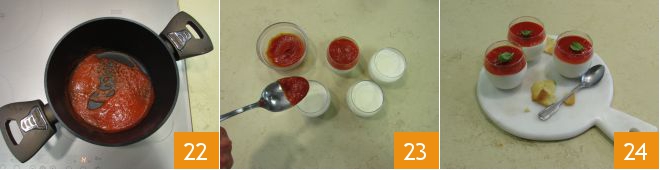 transfer back into the saucepan and cook for a few minutes until it becomes thicker 22. Let it cool slightly and pour over the semi-set panna cotta 23. Place back in the fridge for another couple of hours. When serving, garnish with basil leaves 34.