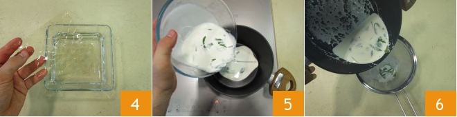 Soak the gelatin leaves in a bowl with cold water 4 and meanwhile, heat the cream and basil by pouring the mixture into a saucepan 5. As soon as it reaches a simmer, strain the cream through a sieve 6